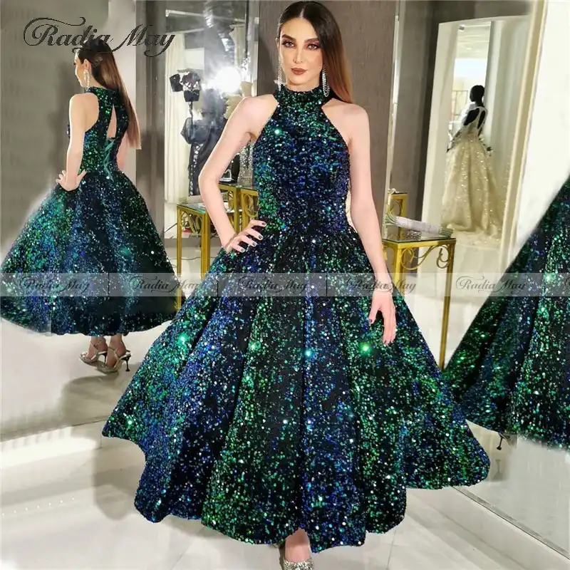 Sparkle Sequin Emerald Green Short Arabic Evening Dress Tea Length Vintage Prom Dresses 2020 Elegant A Line Semi Formal Gowns Evening Dresses Aliexpress