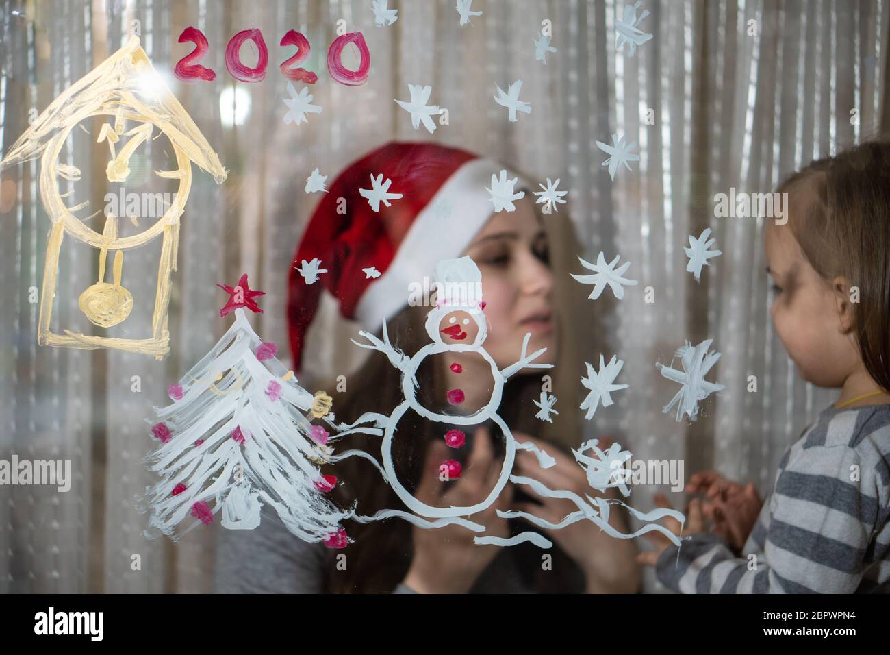 Mom And Daughter Draw A Snowman A Christmas Tree And A Clock With Paints On A Window Pane Drawing With Acrylics On Glass Stock Photo Alamy