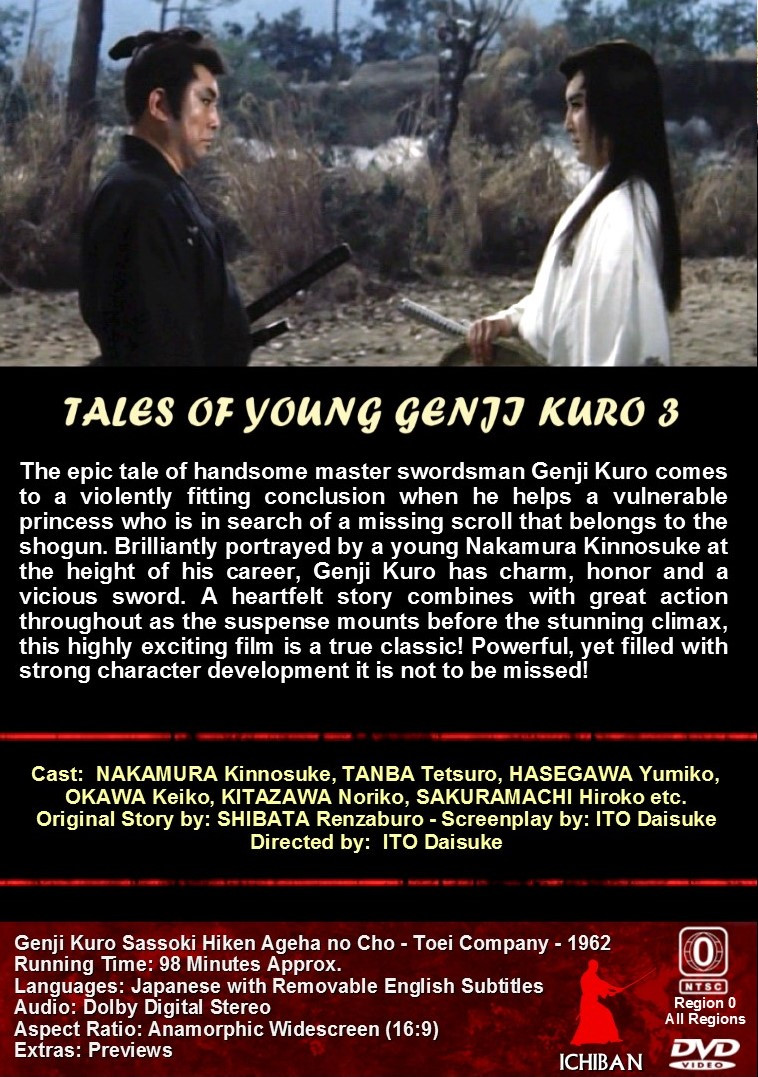 Story : In the third, and final chapter of this epic tale, handsome swordsman Genji helps a vulnerable princess who is in search of a missing scroll that belongs to the Shogun. This is one of the most highly regarded trilogies featuring a youthful Nakamura Kinnosuke in one of his best roles. This was Kinnosuke at the height of his career, with charm, honor and a vicious sword. If you enjoyed the first two films in the series, you can't miss the exciting conclusion. Even without know-ledge of the first two films, this movie stands on its own with great action throughout!